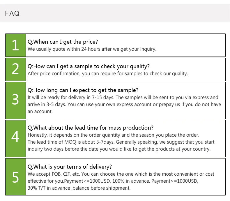 2. Delivery : By sea for orders, by express for samples.