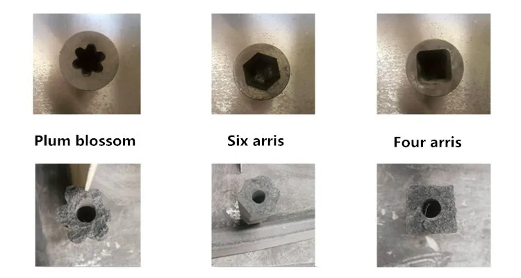 After putting powdery materials into the machine inlet, the motor drives the screw to rotate to press them into different shapes of six arris or other forms.
