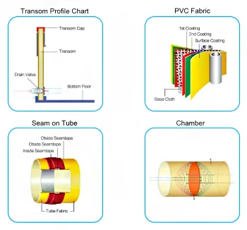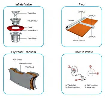 1.Overall length: 270cm Overall width: 151cm Tube diameter: 42cm2.Floor type: plywood floor 3.Marine plywood transom for outboard motor 4.Three individual air chambers 5.Large an-ti split rubber strake around 6. One way drain valve with plug 7.rope holder with lifeline 8.Stainless steel D-rings for easy towing 9..lift handle for easy carry
