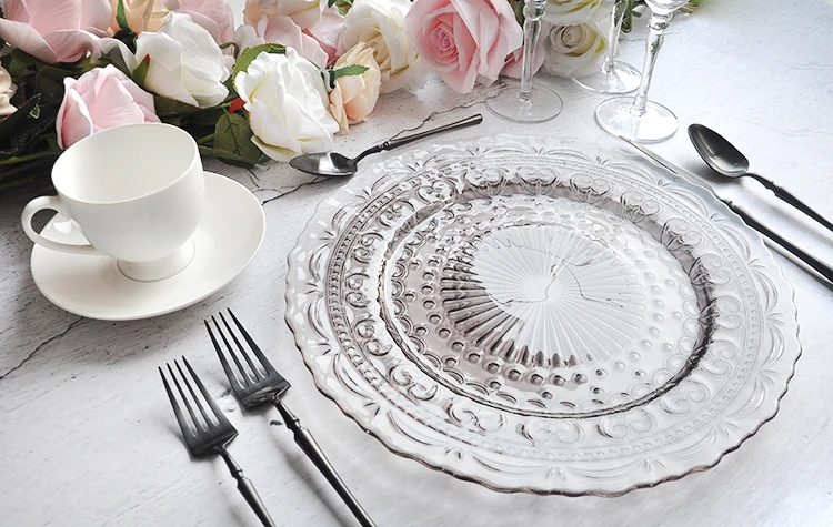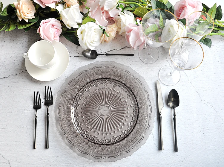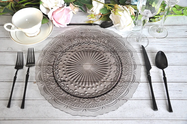 Name | 13 Inch Vintage Embossed Gray Glass Wedding Lace Charger Plates Wholesale |