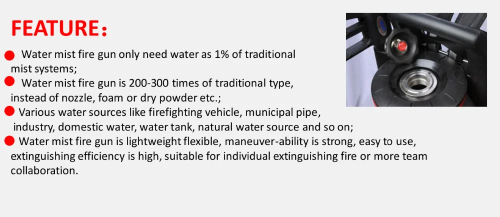 2,It is very popular with vital functions for extinguishing jobs in civilian fire, B type fire and fire situations with higher requirements(such as airports, military warehouse, cultural relic sites and so on)