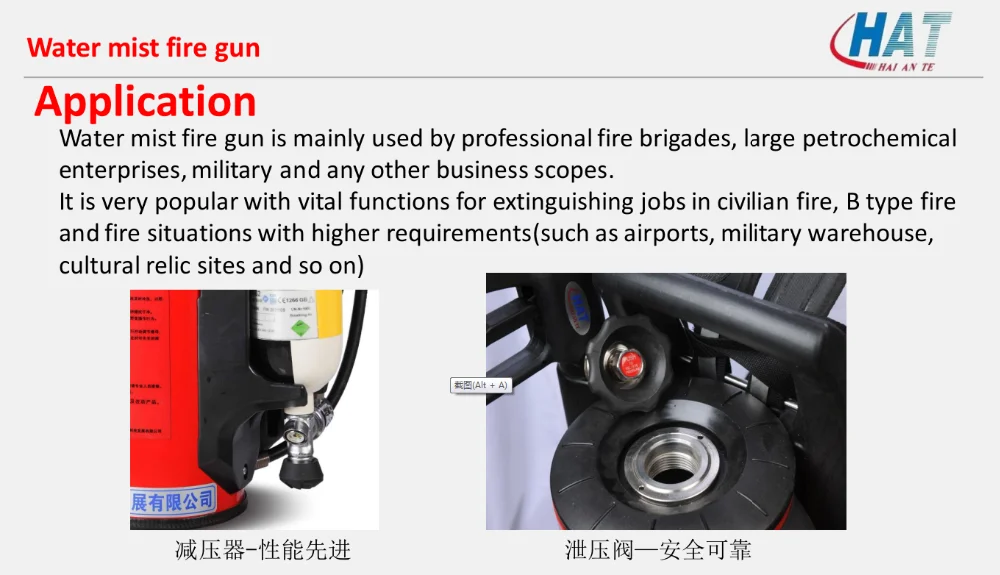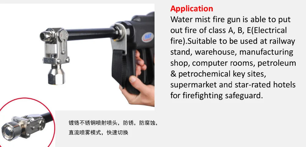 1,Water mist fire extinguisher is mainly used by professional fire brigades, large petrochemical enterprises, military and any other business scopes.