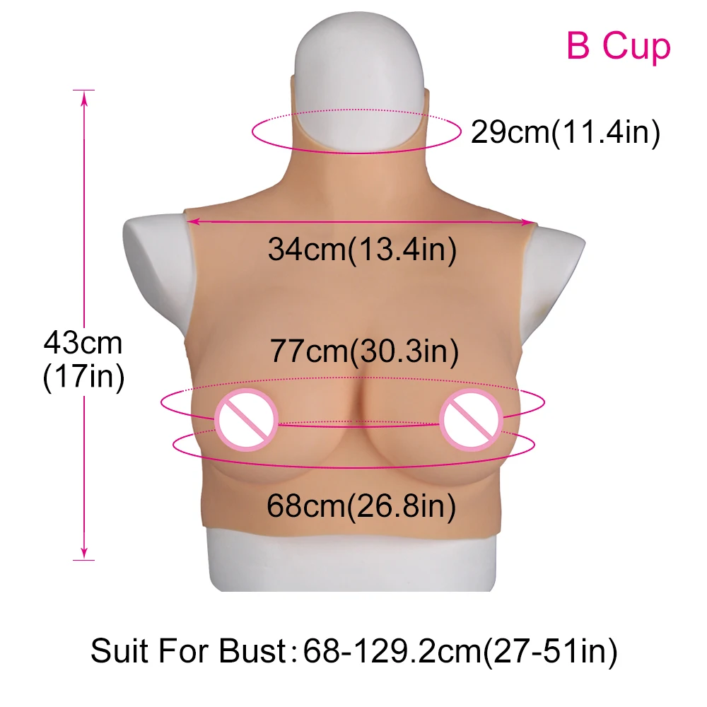 Fully enclosed liquid silicone : Pros and Cons : Touching extremely realistic.Boobs shake like real ones when you run or jump. The weight a little heavy. Fully enclosed elastic cotton: Pros and Cons : Light and comfortable, the breast forms without bra also can in good shape . Not being able to follow the movement, it will be slightly rigid.Cheaper than silicone filler . How to judge the size is suitable for you? You can judge the size according to our detail information and pictures. While if you cannot decide yourself, please offer us the following information and we will give you professional advice: (1) Your chest circumference (2) Your height and weight (3) The cup size you want to achieve (4) Neck circumference and waist circumference