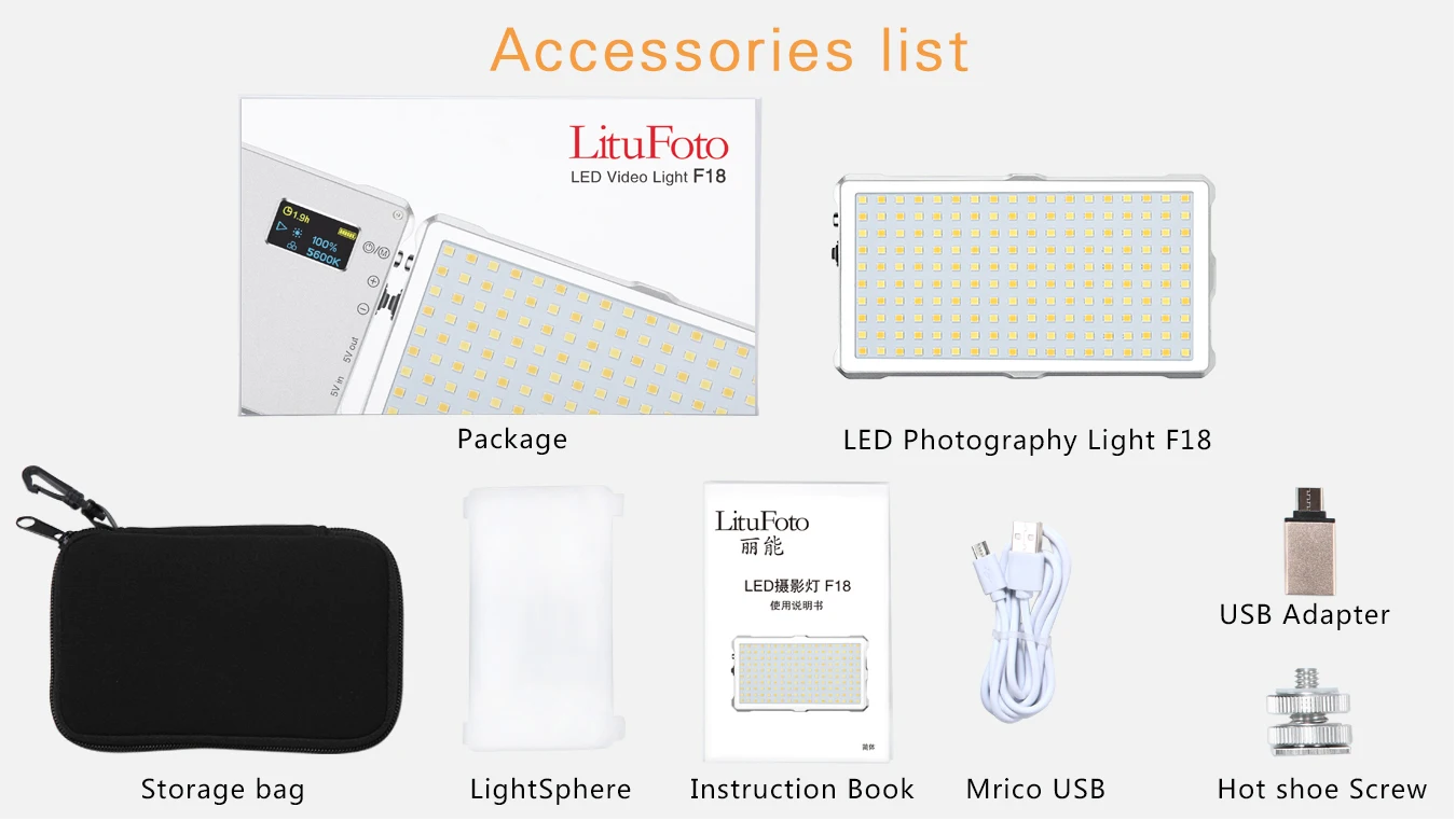 Standard Items | F18 LED Photographic Light: 1 pcsUSB Adapter: 1 pcs Hot Shoe Screw: 1 pcs Diffuser: 1 pcs Manual instruction: 1 pcs Storage Bag: 1 pcs |