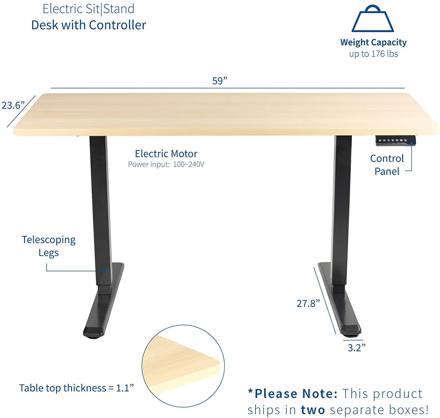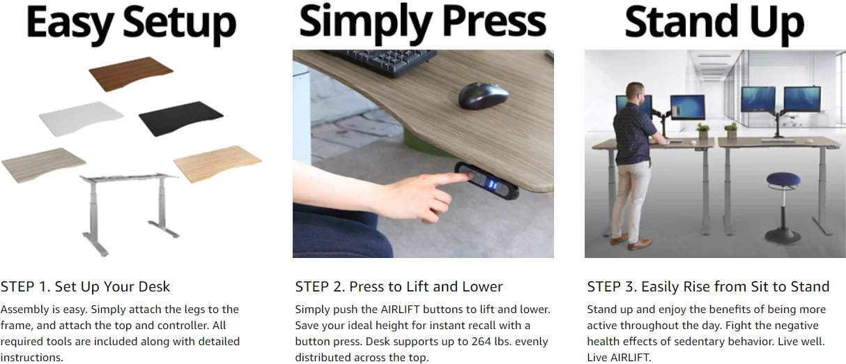 Dual motor mechanism Super quiet 35db (industry average 55db) Height memory control panel (The desk remembers your chosen heights) Built in anti-collision mechanism Height range of 64cm - 130cm with the desktop in place (suitable for people up to 6'8") Adjustable width suitable for desktops between 1.2m and 2.0m Available frame colours are black, white or silver