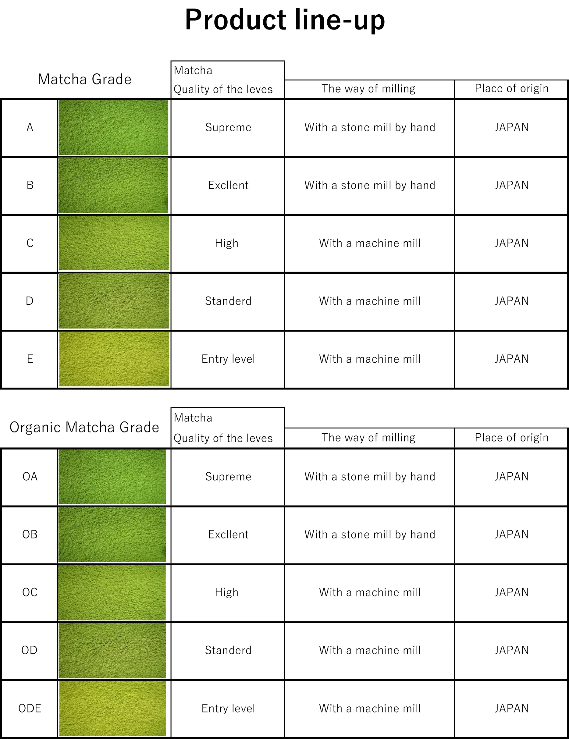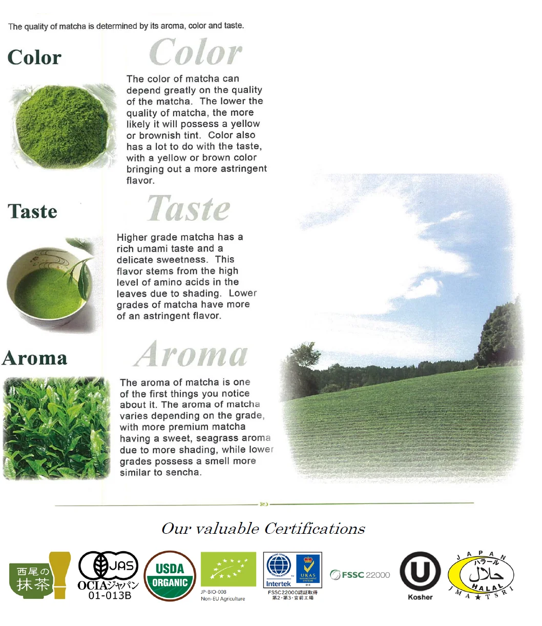• Organic Matcha made from 100% domestically-produced organic Tencha.AOI is one of the leading organic Matcha manufacturers, so we can ensure high quality and avaliabillty for your needs. We can pruduce these series as HALAL products when it is requested. e.g".Organic Matcha AH-OA |