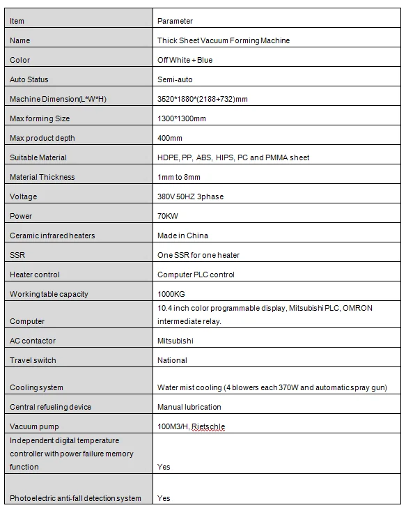 It is suitable for producing vacuum formed sheets thick from 1 mm to 8 mm in all shapes. Suitable material can be PC, acrylic, ABS, HIPS, PET, PVC, PP and PE sheet. It is widely used to produce lampshade, hard thick shells, covers and sheets for various appliance, facilities and machines.