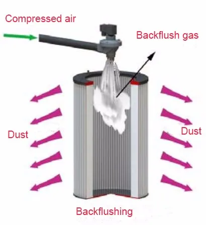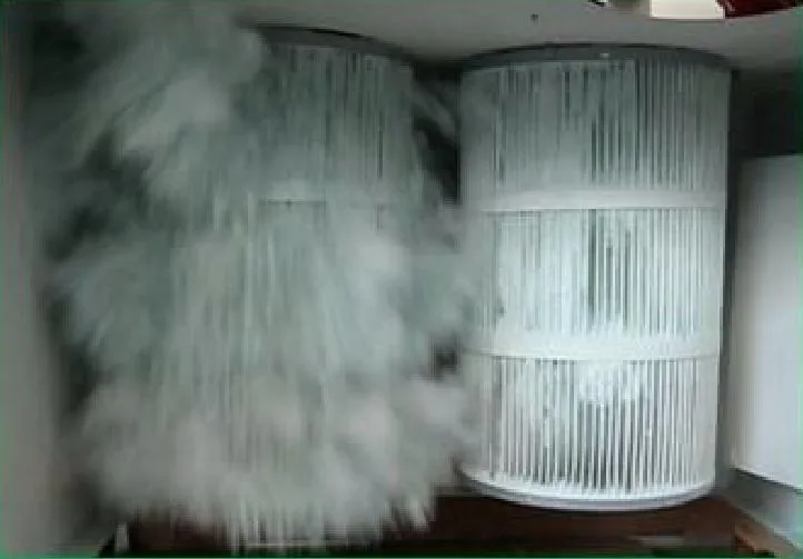 When the pulse controller does not send a signal, the pulse solenoid valve starts to work. Each time the spray cleaning is completed at 0.1~0.3S, the high pressure air sprayed at this moment has a good cleaning effect. The air enters the filter cartridge at a high flow rate, causing the filter cartridge to expand rapidly, causing a shock vibration, so that the dust attached to the filter cartridge is shaken off, and the dust adsorbed on the surface of the filter material is shaken to the dust collecting bucket under the action of the airflow. .