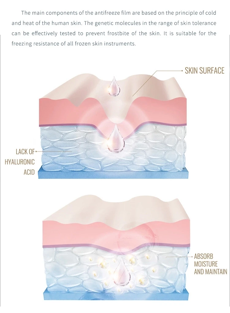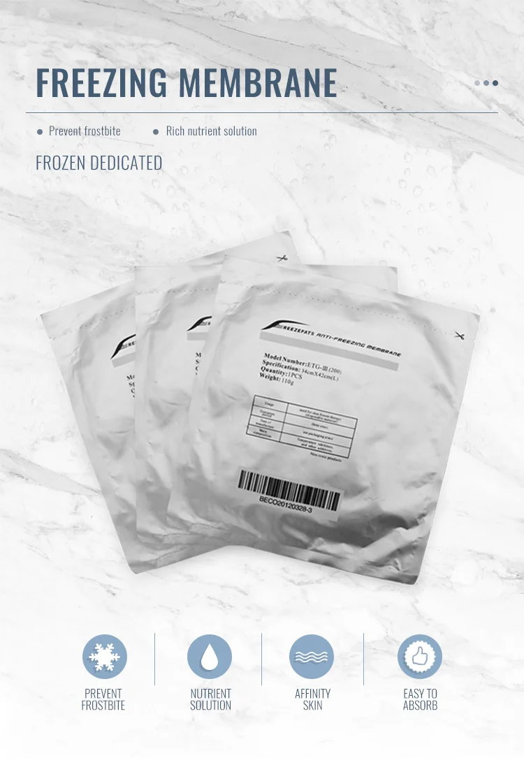 At a certain low temperature , subcutaneous adipose tissue will be converted to solid and machine is use this theory premature aging of fat cells , so as to achieve the effect of weight loss .But some human tissue parts are fragile , if it is directly contact with machine and there will moderately frostbite, so in order to avoid this problem , we especially make a kind of organic pad that is antifreeze mambrane , it can effectively protect the treatment area to frostbite. Antifreeze mebrane is an important and necessary part of every, single treatment with the most advanced method of eliminating fat - . Antifreeze mebrane contains hypoallergenic substances that during development have proved most suitable for safe and clean handling and basic membrane was fabricated using a new, advanced technology nanostructures.
