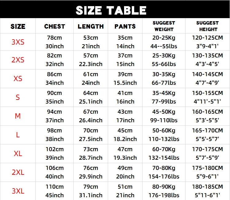 Size&Color | 3XS/2XS/XS/M/L/XL/XXL/XXXL or Customized | ||||||