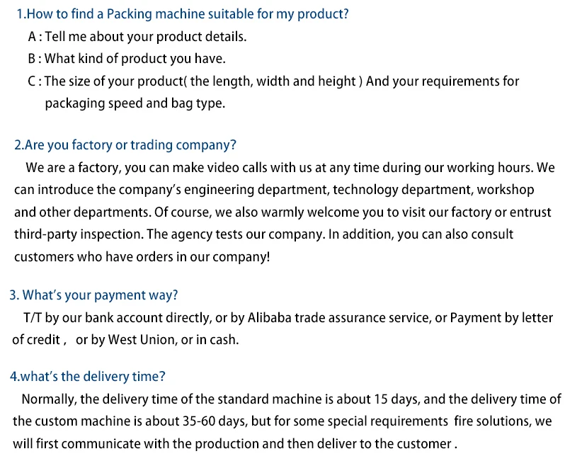 Packing Speed | 40-180bag/min | 30-150bag/min | 30-150bag/min | 20-150bag/min | ||||