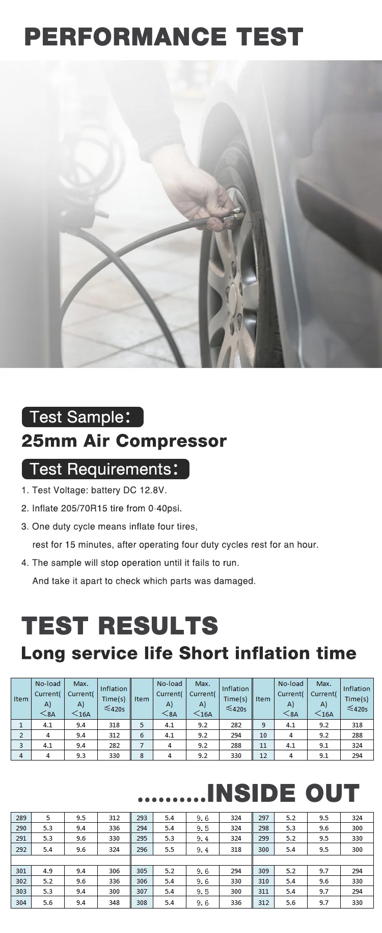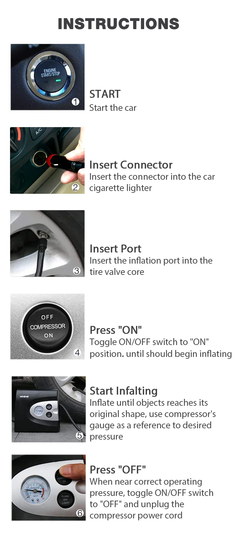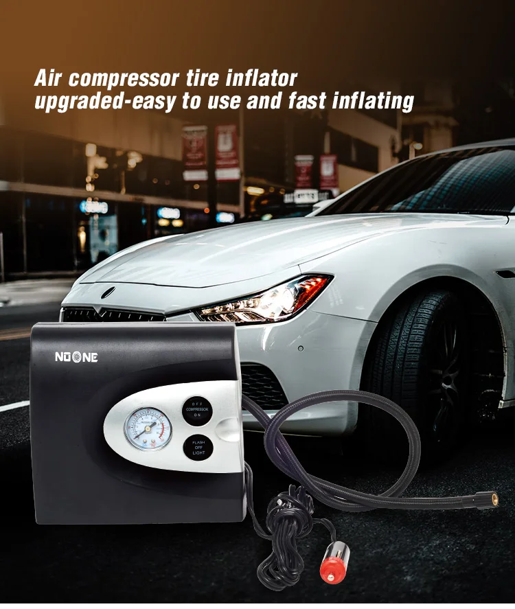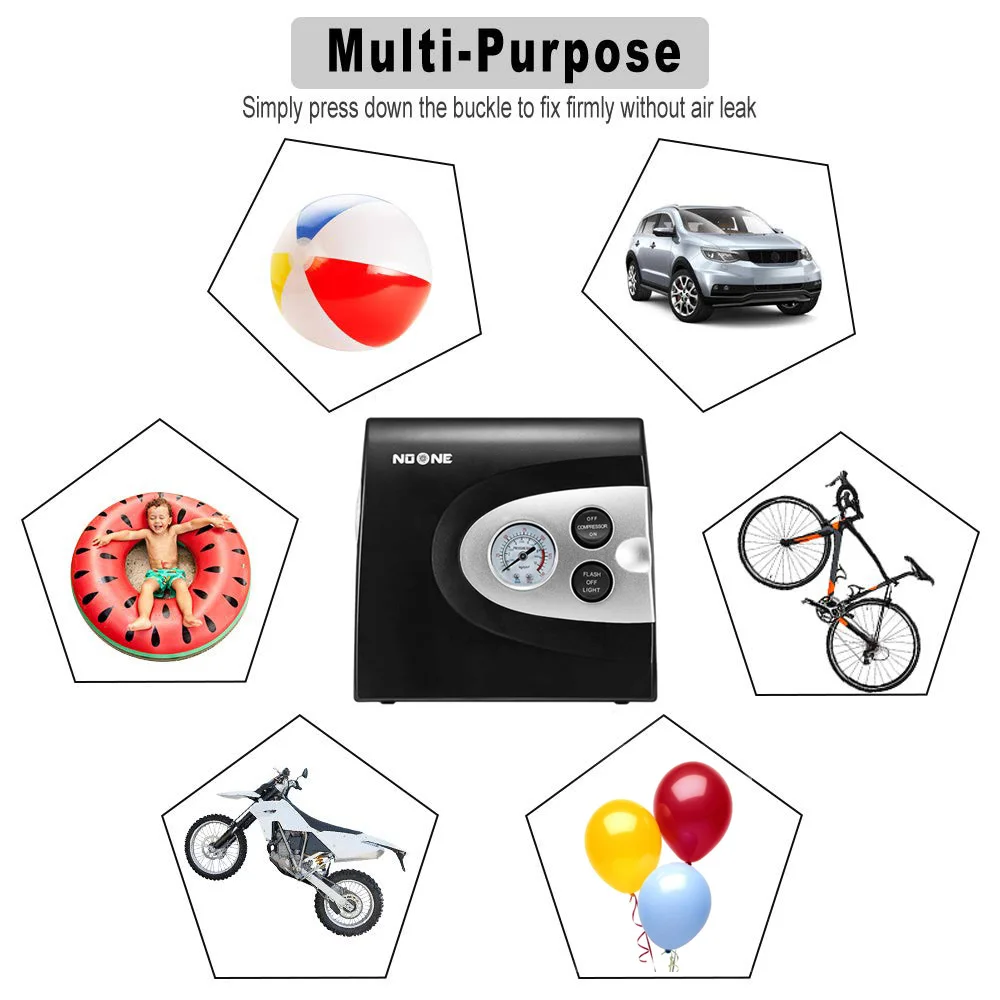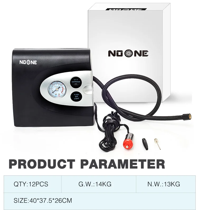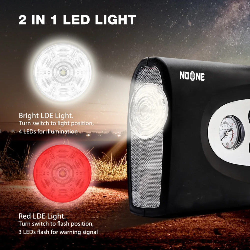 FEATURES | a. Strong power&fast inflators for automotive and light truck b. Read the voltage(switched off) to recommended pressure gauge c. Used to inflate low pressure inflatables such as rafts, cushions and sports balls d. 3 in 1 function: Light for night, powerful inflating, measuring air valve e. 3LEDS flash for warning signal, 4LEDS for illumination |