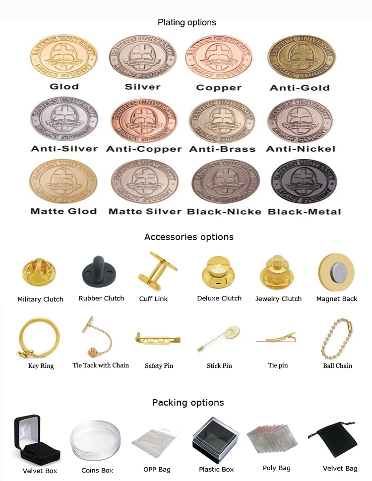| Craft | Hard enamel, soft enamel, 3D, offset print, silk sreen print, etc |