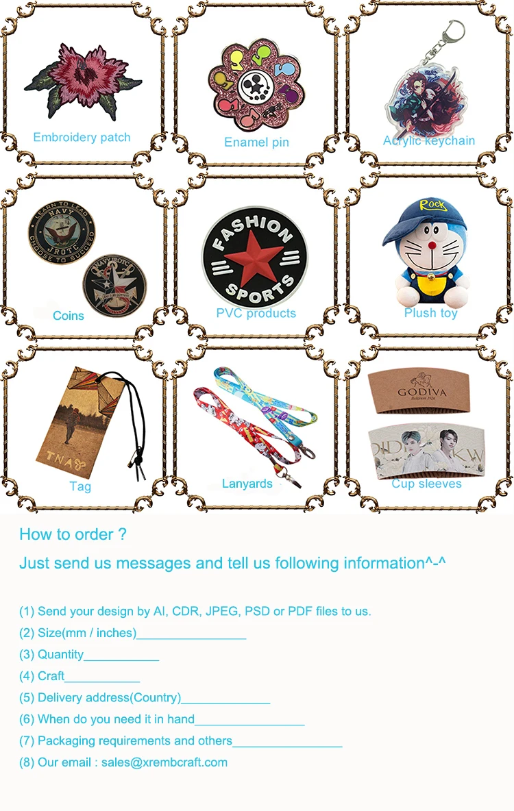 | Our services | Embroidery Patches ,Enamel pins, challenge coins,key chains, etc. |
