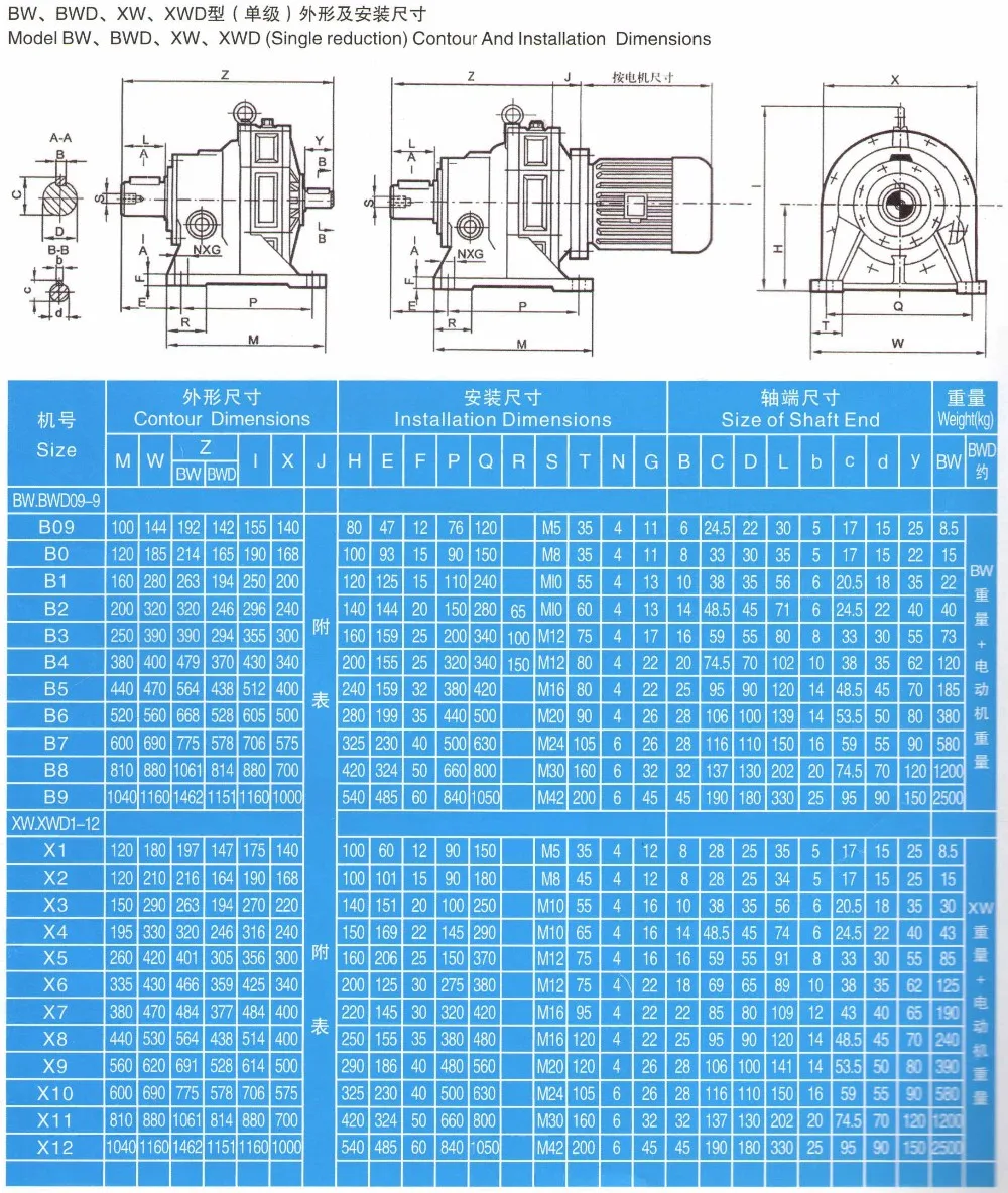 Cycloidal gear reducer has solid shaft output, hollow shaft output and contract disk hollow shaft output,which can be installed horizontally , vertically. Cycloidal Gearbox is made of high strength quality alloy steel through quenching and possesses high efficiency and long life gear .Othermore,Cycloidal gear reducer can bear large axial and radial load.Features is low in run noise, high in reliability, compact and so on.