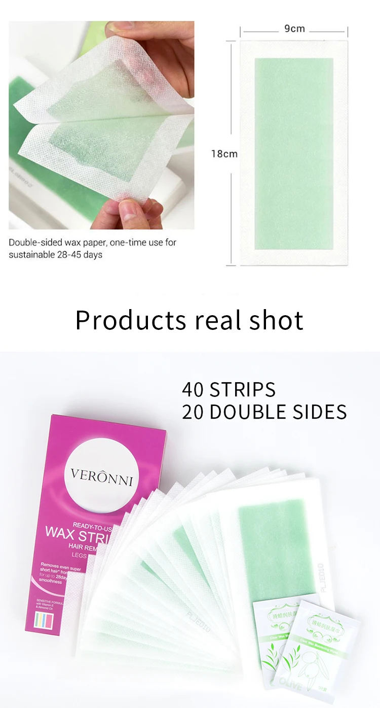 Product Name | 2sheet/pcs 18*9cm one size 40pcs Double Side Cold Wax Strips Paper For Women Leg Body Face Hair Removal Paper Depilatory Cream OEM | |