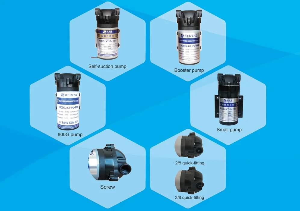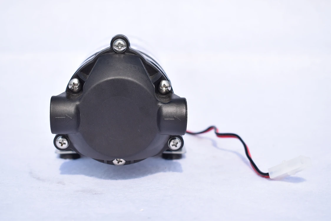 A1: The diaphragm pump is specially chosen for RO system because it does not require constant working for the pump, and the working process is controlled by the pressure change and water flow change from the water supply side to the treated water side. The diaphragm pump works by using the motor part to generate power and water flow to the water chamber of the pump head, the deliver water with enhanced pressure for the RO membrane, the diaphragm pump is taken as the heart of the RO system to provide running power.