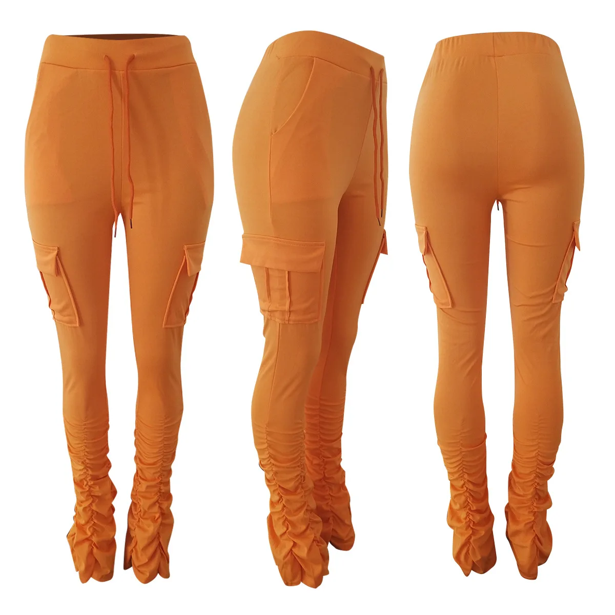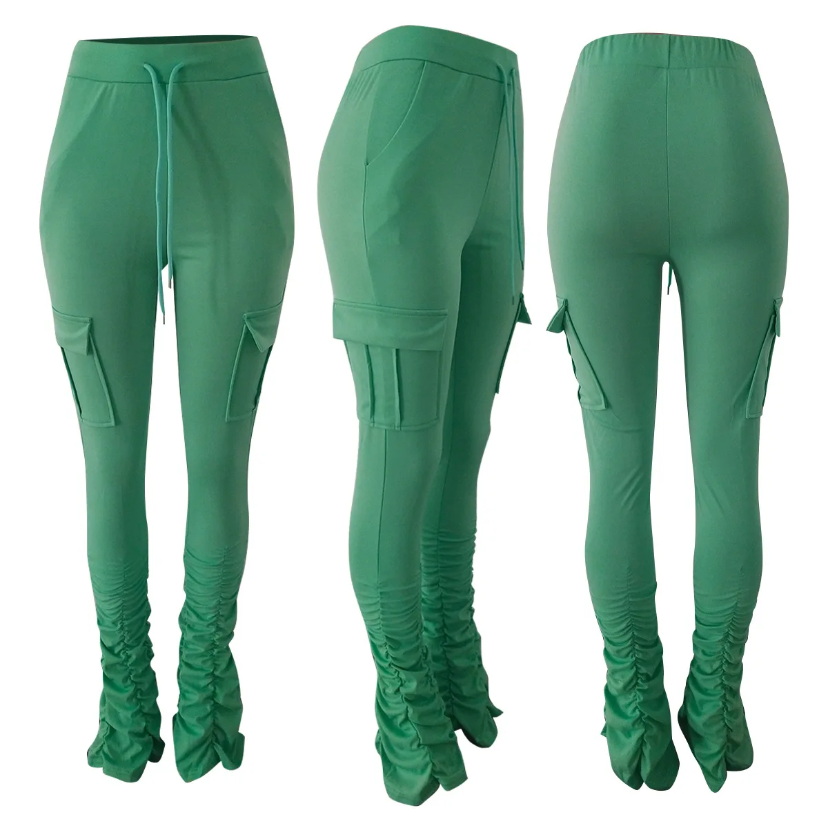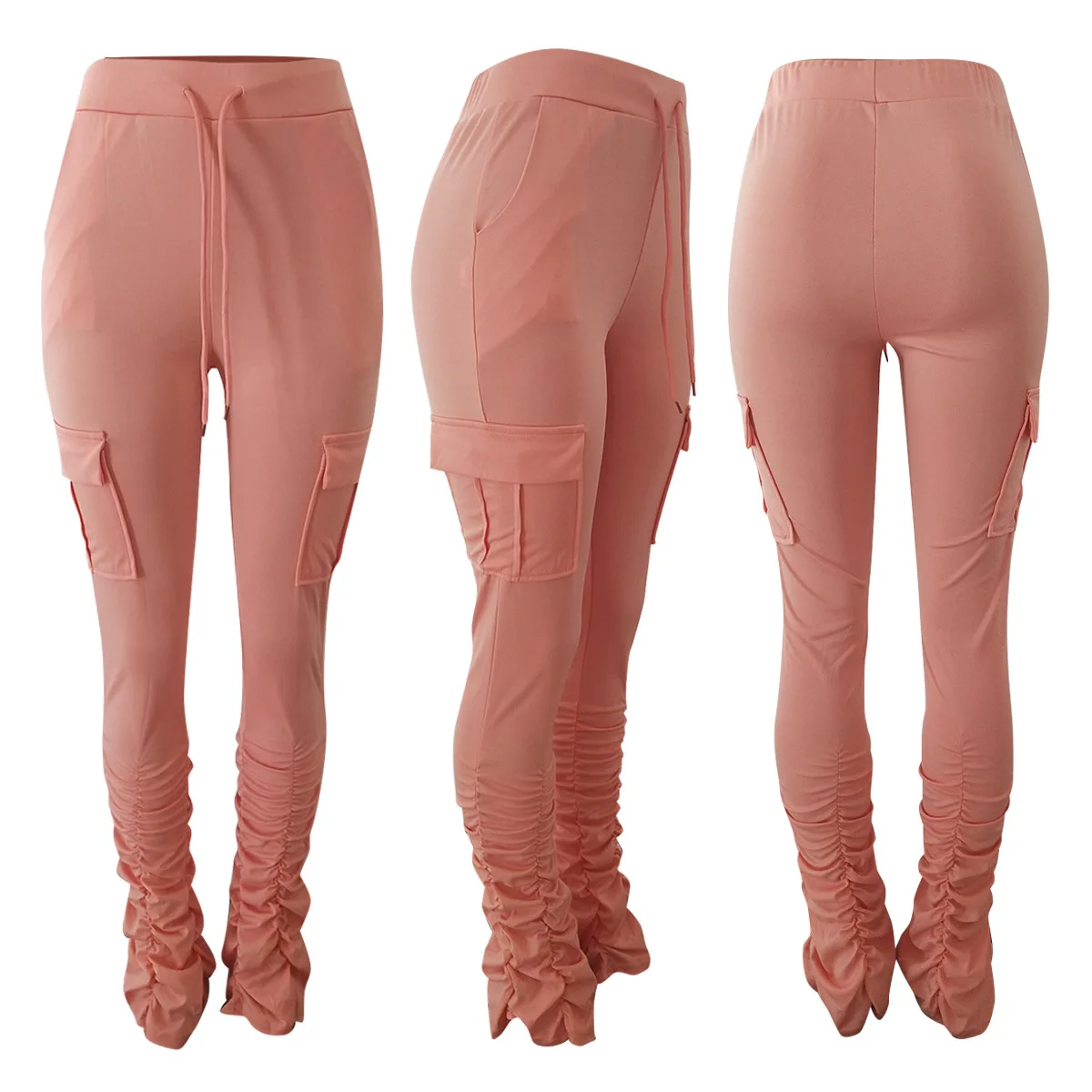 2022 New Arrivals Drawstring Solid Color Pocket Flare Legging Women Sweat Pants with Ruched Sides Tight Stacked Pants