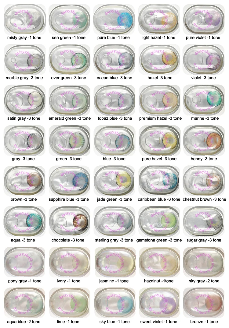 Colors | 50 Colors (can be mixed in an order) Naturals(1 tone): light hazel,pure blue, sea green, misty gray, pure violet Impressions(3 tone): hazel, marble gray,ocean blue,ever green,violet Premium(3 tone) : satin gray, emerald green, topaz blue, premium hazel, marine Blends(3 tone): gray,green,blue,pure hazel,honey,gemstone green,sapphire blue,sterling gray, jade green, aqua, caribbean blue, brown, chocolate,chestnut brown,sugar gray Super Naturals(1 tone & 2 tone): pony gray, ivory, jasmine, hazelnut, sky gray, aqua blue, lime, sky blue, sweet violet, bronze, icy green, pink, black, amber, turquoise Extra(2 tone): platinum gray, party green, gold honey, brilliant blue, cappuccino |
