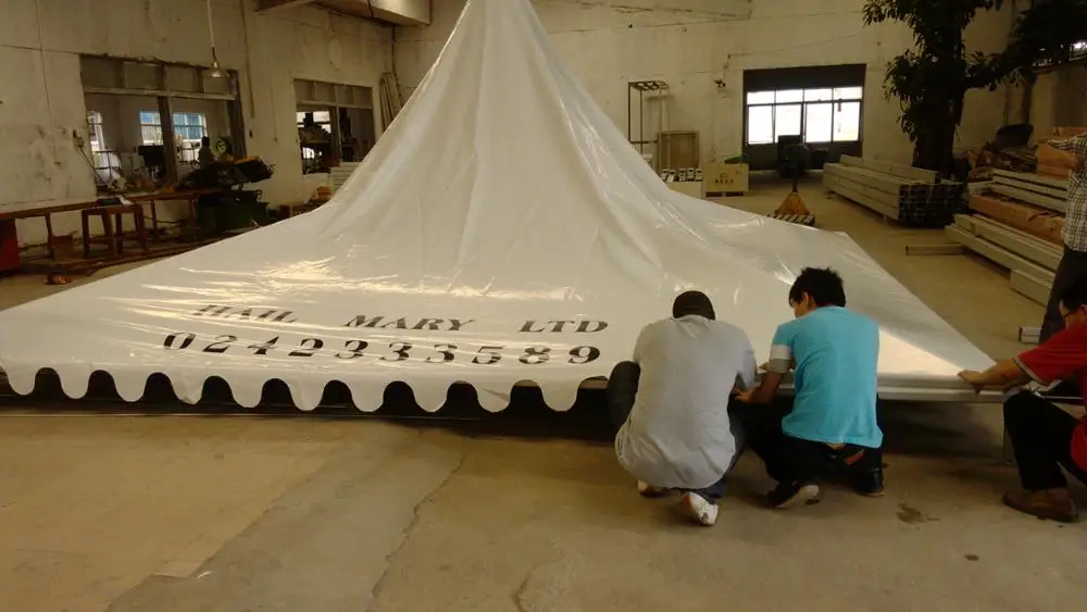 Cover material | Double PVC coated polyester fabric, Water-proof, snow-proof, flame retardant to DIN 4102 B1,M2 German Weight: 650-850G/square meter Color available: yellow, white, red, blue,and more | |