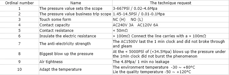 This type product is mainly used in high-low pressure protect control of air conditioning cooling system and other electric equipment.When the pressure inside the system is over or below rated safe pressure,the disc in sensor will start move instantly,and this works together with the connecting rod and push the switch connector to open or close.When pressure deduce or rise to rated to reset point,the disc will reset accordingly,and the switch also reset.
