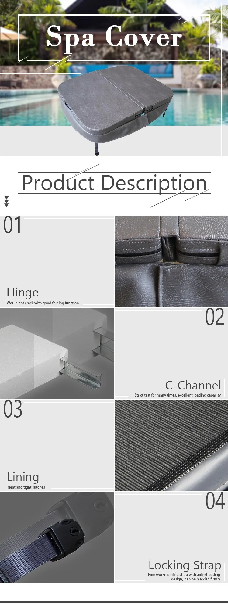 resistance ,Abrasion resistance 3. Bottom vinyl : cold cracking resistance ,burn resistance ,Mildew resistance ,Abrasion resistance . 4. Foam: Closed cell and virgin EPS foam with high density . 5. Internal structure: Aluminum alloy for reinforcement 6. Thread : Double stitched with high grade bonded polyester .UV resistance . 7.Rust proof zips. 8.Tie downs : Four tie-down straps with reliable fasteners, Fully key lockable for peace of mind. 9.Handles : Reinforced nylon material for easy handling . 10.Hinges : The hinges area have 4-layer quadruple ,reinforced 11.Skirt : With 4.5 inch for increasing its heat insulation value .