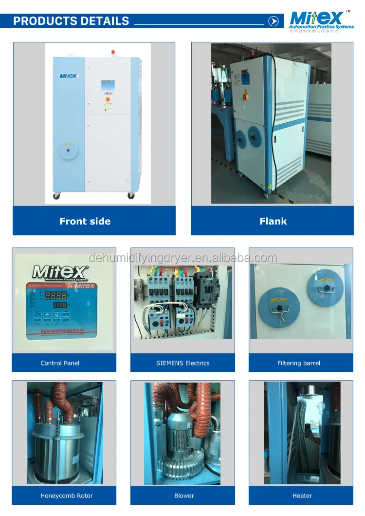 MD-DH series honeycomb dehumidifiers are mainly used to dry hygroscopic engineering plastics. A honeycomb -rotor is used to offer effective drying, which under ideal conditions, can supply dehumidified dry air with a dew-point lower than -40°C.This series comprises 14 models of honeycomb dehumidifiers, the largest of which can provide dry air up to a quantity of 3,000 m3/hr.