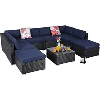 Набор садовых диванов с синей подушкой, уличные предметы с диваном, плетеный стул и стол
