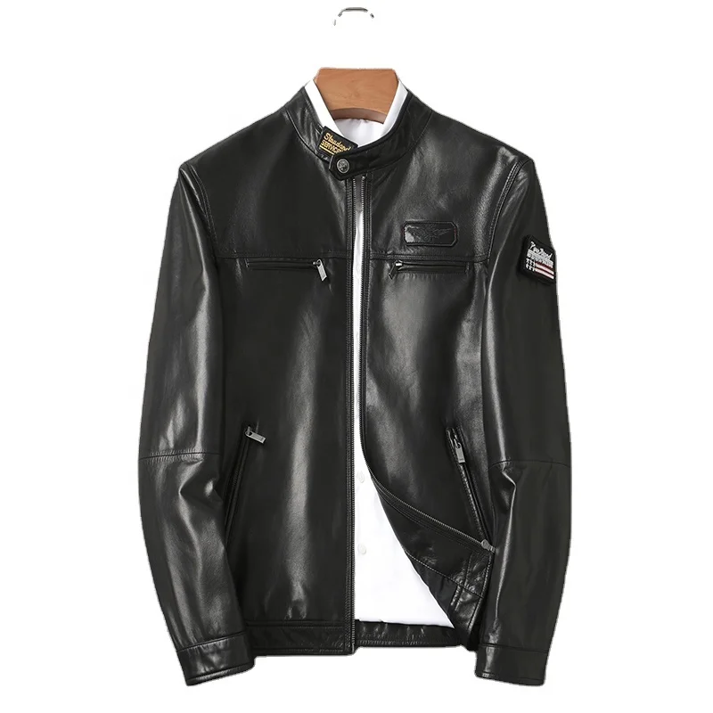 Мужская кожаная куртка из натуральной козьей кожи, черная Повседневная куртка на молнии с острым воротником, простой дизайн