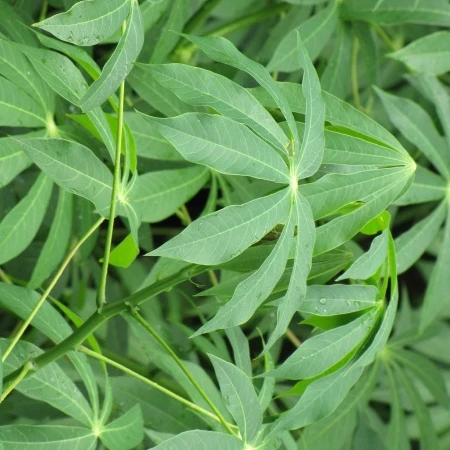 Cassava is grown for its enlarged starch-filled roots, which contains nearly the maximum theoretical concentration of starch on a dry weight basis among food crops. Fresh roots contain about 30% starch and very little protein.