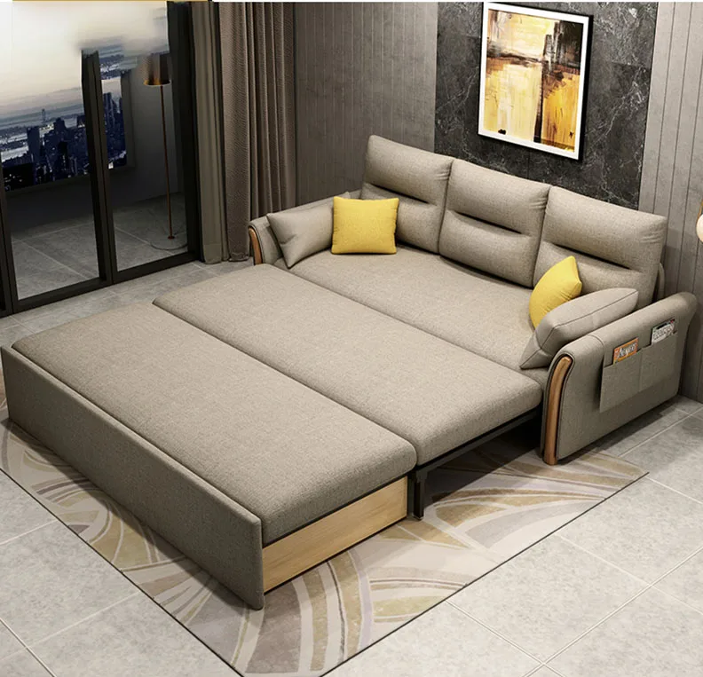 Практичная многофункциональная кровать с диваном, ленивая рама из массива дерева для гостиной, тканевый диван-кровать двойного назначения для спальни