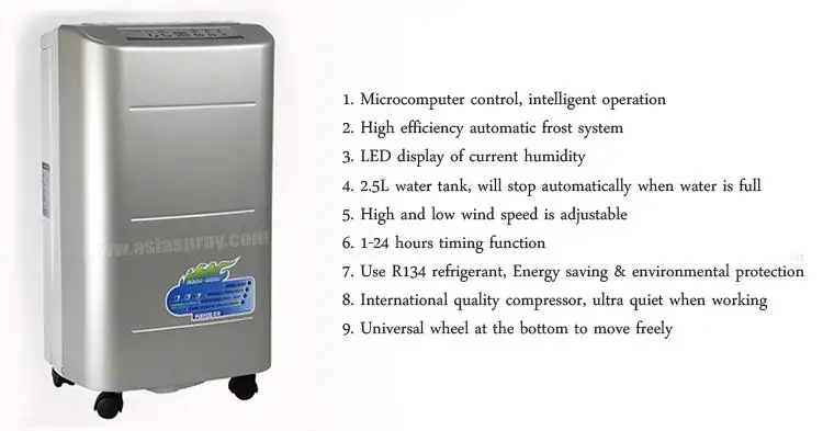 Влажный контроль температуры и влажности контроллер бытовой осушитель сделан Deeri технологические инновации Осушитель воздуха может эффективно контролировать влажность, предотвращать попадание влаги, быстро сушить на воздухе и предотвращать различные заболевания, вызванные влажностью, такие как ревматизм, артрит и другие болезни пожилого возраста. Пусть у вас будет ощущение солнечного света, пусть вас больше не будет из-за влажности и беспокойства. 2. Принцип домашнего осушителя Домашний осушитель вытягивает влажный воздух в машину через вентилятор и охлаждает испаритель ниже точки росы через Компрессорное Охлаждение. Влажный воздух конденсируется в воду на поверхности через испаритель, а затем поступает в резервуар для воды после того, как собирается в приемную кастрюлю. Сухой воздух нагревается конденсатором и выводится из воздухозаборника, тем самым постоянно снижая влажность в помещении.