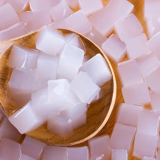 Nata de coco is a chewy, translucent, jelly-like food product produced by the fermentation of coconut water, which gels through the production of microbial cellulose by Acetobacter xylinum. Nata de coco is most commonly sweetened as a candy or dessert, and can accompany many things including pickles, drinks, ice cream, puddings and fruit mixes.