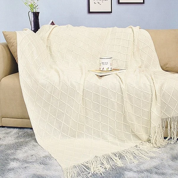 Оптовая продажа, шерстяной трикотажный кабель с бахромой высокого качества, мягкие большие размеры, белые кремовые одеяла оптом