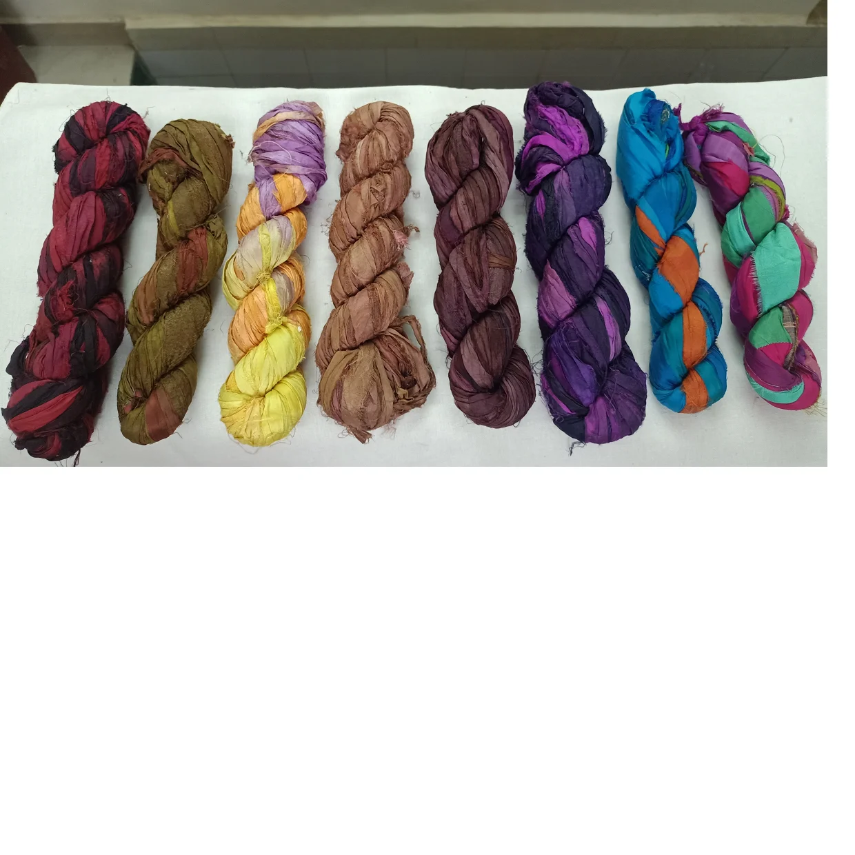 We also manufacture Sari Silk Yarn, Sari Silk Ribbon Yarns, Sari Silk Sliver, Muga Silk Yarn, Muga Silk Sliver, Eri Silk yarn, Eri Silk Sliver, Tussah Silk yarn, Tussah Silk Sliver, Mulberry Silk Sliver, Mulberry Silk Yarn, News Paper yarn, Silk Wool Yarn, Silk Linen Yarns, Cotton Yarns, Fuzzy Sari Silk Ribbons, Nettle Silk Yarn, Hemp Yarns, Pineapple Yarns, Banana Yarn, Banana Silk Yarn, Sisal Fiber, Pineapple Fiber, Banana Fiber, Sisal Yarn, Sea Grass Yarn, Denim Ribbon Balls