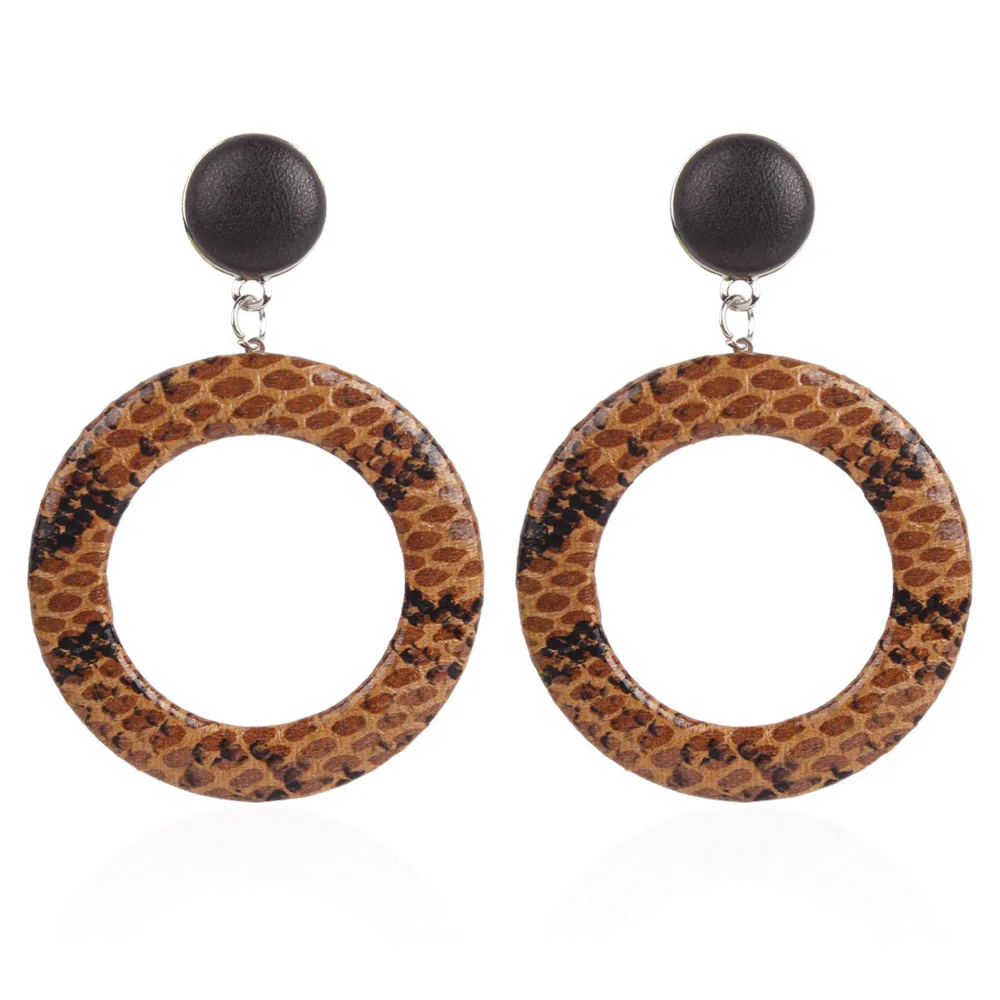 Купите 10 и получите 1 бесплатно, женские круглые висячие серьги из искусственной кожи со змеиным узором, коричневые серьги из змеиной кожи