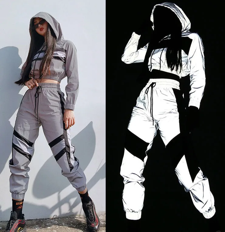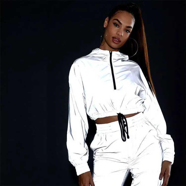 Женский костюм-двойка на заказ, укороченный светоотражающий спортивный костюм, комплект для женщин и взрослых, эластичная лента, манжеты, дизайнерский спортивный костюм, 200 комплектов Женский костюм-двойка на заказ, укороченный топ, светоотражающий сп