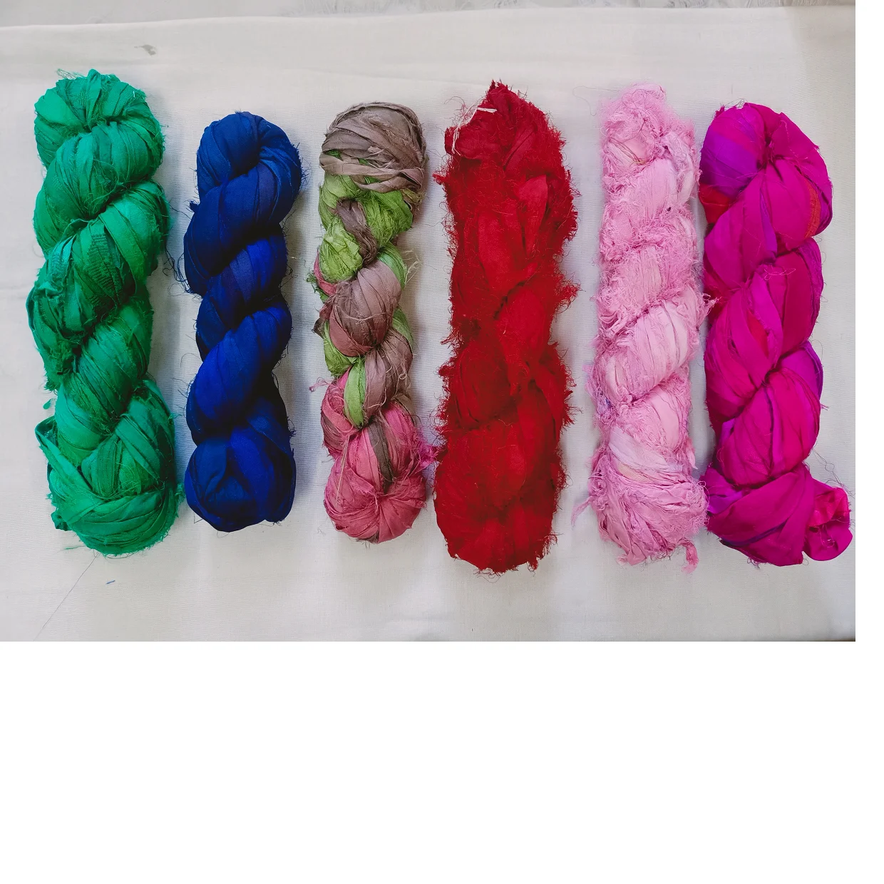 We also manufacture Sari Silk Yarn, Sari Silk Ribbon Yarns, Sari Silk Sliver, Muga Silk Yarn, Muga Silk Sliver, Eri Silk yarn, Eri Silk Sliver, Tussah Silk yarn, Tussah Silk Sliver, Mulberry Silk Sliver, Mulberry Silk Yarn, News Paper yarn, Silk Wool Yarn, Silk Linen Yarns, Cotton Yarns, Fuzzy Sari Silk Ribbons, Nettle Silk Yarn, Hemp Yarns, Pineapple Yarns, Banana Yarn, Banana Silk Yarn, Sisal Fiber, Pineapple Fiber, Banana Fiber, Sisal Yarn, Sea Grass Yarn, Denim Ribbon Balls