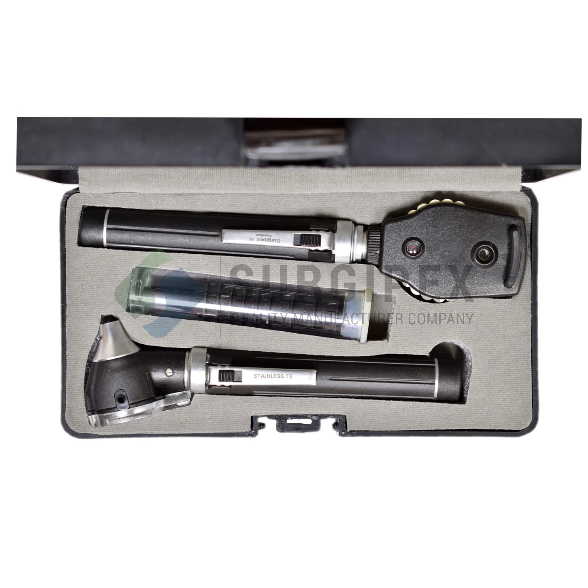 Including: Otoscope Head: Luir Lock Fitting. Chrome Platd. Fixlens 4 x in Plastic Mount Can be removed for introduction of Instruments Spechula Sizes: 2.5, 3.5 & 4.5 mm Included Ophthalmoscope head: Luir Lock Fitting. lens selection wheel permits choice of corrective lenses from 0 to - 20 and 0 to +20 diopters. Single large circle operture. Bent-arm Illuminator: pin contact fitting. Nasal Speculum: Chrome plated. Two laryngeal mirrors: n.4 and 5. Battery handle: 28mm. For 2 Cell C-batteries Chrome plated. For adjustment of all Illumination Replacement bulb: 2.5V