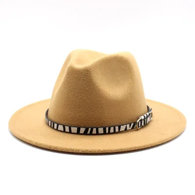 Зимняя модная плоская широкополая фетровая шляпа Федора для женщин и мужчин шерстяная Федора с узором зебры кожаная шляпа с ремешком джазовая шляпа с индивидуальным логотипом