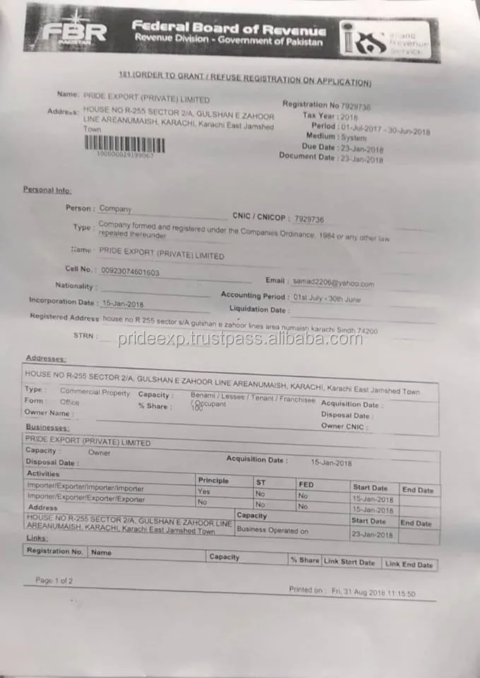 Factory unit: | Our factory unit located in Karachi near Karachi Industrial Estate which provides easy access to our valuable overseas customers. We are direct manufacturer with all the high quality manufacturing facilities under one roof which means our products consistently produced higher quality standards according to customers' requirements. We always welcome you to visit our factory. |