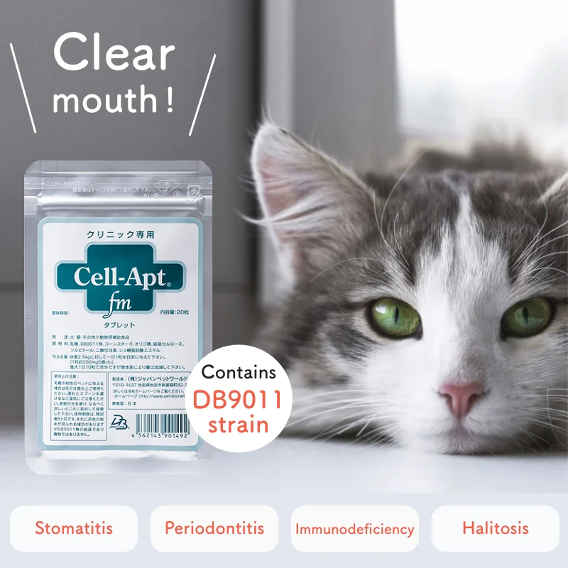 “Cell-Apt” is a dietary supplement for dogs and cats that was developed to support veterinary medicine. The DB9011 strain in Cell-Apt supports not only oral health, but also skin, mucous membranes, and the health of dogs and cats that are concerned about aging.