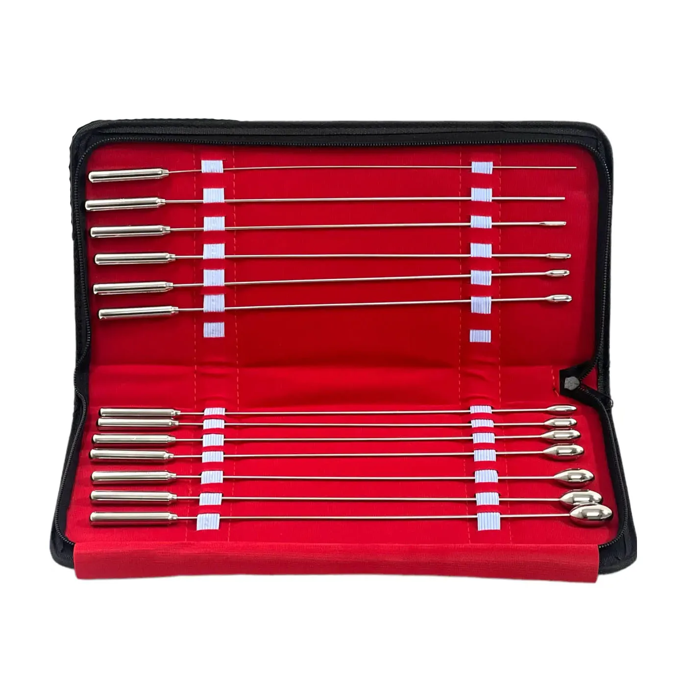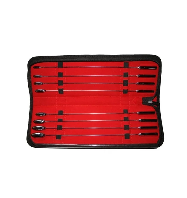 Size: | Rosebud Sounds are very unique and very effective in urethral stimulation. The bud-like tip causes a highly sensitive, centralized feeling as it slips in and out! Eight 30 cm long fine steel shafts topped with a rosebud or bullet shaped tip in various sizes from approximately 1.6mm to 13mm in diameter included in this set. The sounds are protected in a velvet-lined zipper case. Measurements: 11.75 inches in length Material: Steel Color: Grey Note: 8 sounds of varying diameters included | ||||||