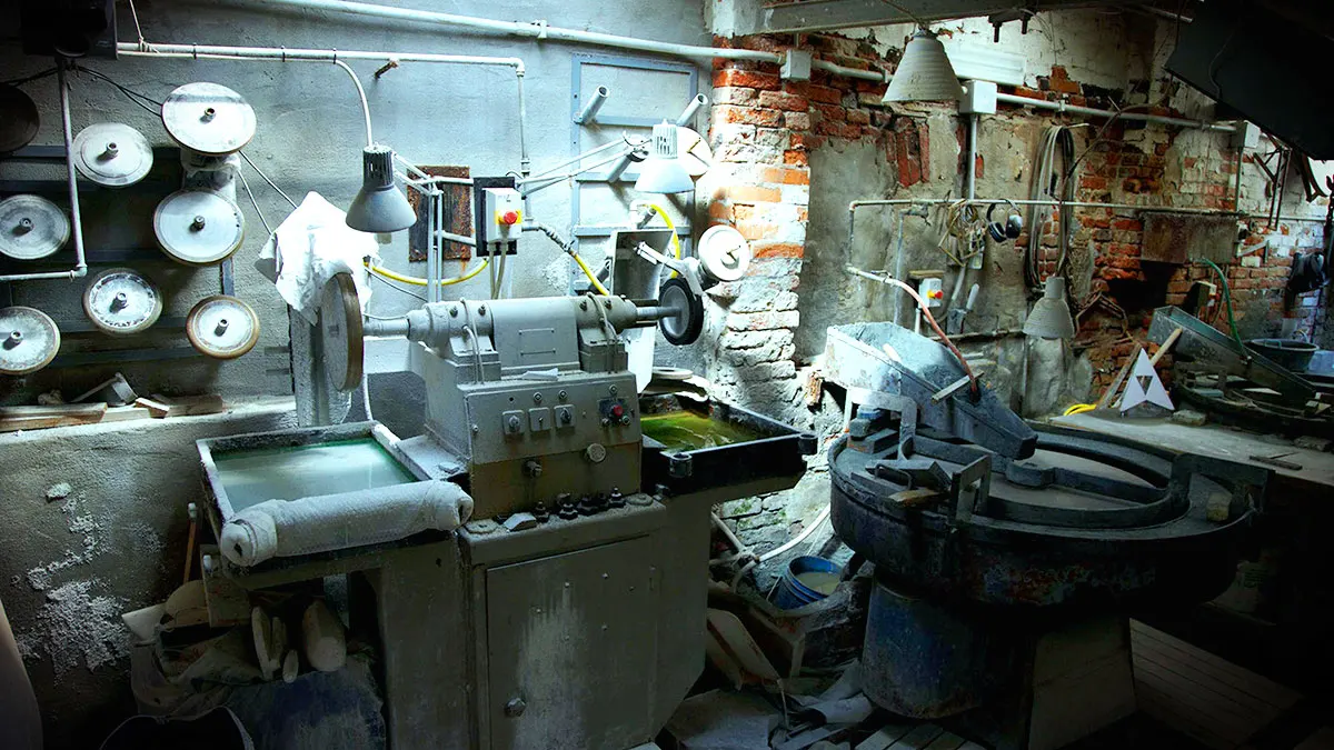Once the design has been finalized, the Mandruzzato family then begins to bring the creation to life. Since temperatures can vary, the total amount of time spent producing a single piece can range from 4 8 consecutive days. Raw materials melt at rather high temperatures, in which our artisan usually starts by blowing color into the glass. Layers of mixed metal or extra colors are them added to achieve the perfect finish, whether it be along the lines of transparent "sommerso", "hollow block" or "solid block". The piece is then stored in order to allow it to slowly cool from 1.200 grade C to an ambient temperature. This slow cool-ing process takes about 72 hours. When the hollow or solid block has achieved the proper coolness, the grinding ("moleria") then begins. Glass grinding is a specialty technique that has been used by the Mandruzzato family for ages. The process of grinding consists of 12 skilled steps that involve cutting with diamond wheels and other types of manual machinery. The steps are repeated over and over again until the piece is the idealistic shape and size. During this grinding phase of production, the Italian Consortium, also known as "Vetro Artistico Murano", visits the workshop to certify the authenticity of the items and to ensure that they are fully handmade as well as lead-free. When all checks out, the inspector applies a registration code to each piece. Only a certain number of families in Murano have obtained the authority to produce such items, and we own certificate 38 Family Factory out of only 47 Families Factories.