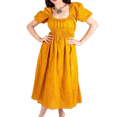 Оптовая продажа Новое поступление летнее хлопковое желтое платье с V-образным вырезом и боковыми карманами повседневное стильное макси пышными рукавами