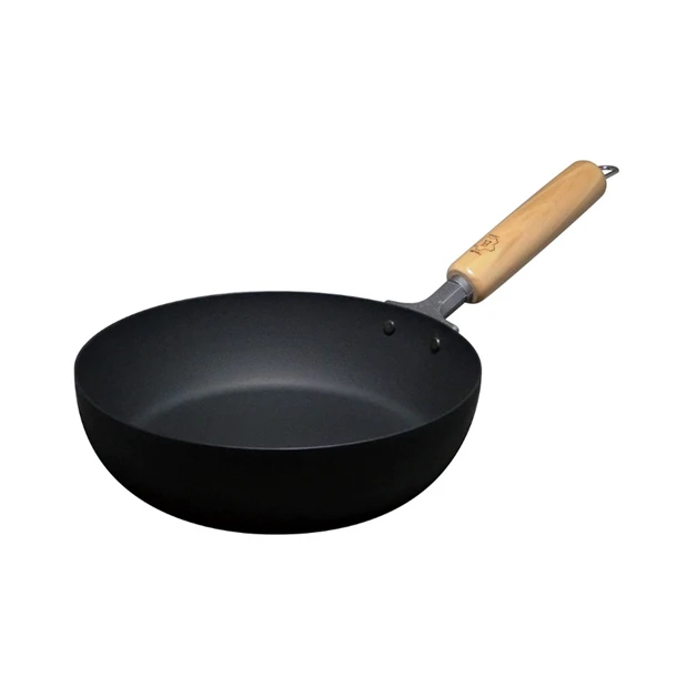 "Tsukumo" the beautiful skillet has been named after one of the ancient Japanese deities, "Tsukumogami," The old myth says a tool that has been used with utmost care as a long-time favorite will eventually become a home for a deity and bring happiness. The pan is made by one and only manufacture called Yamada Kogyosho who makes woks and pans by hammering method in Japan. By repeatedly hammerd over 5,000 times into the mold, the iron is well-fortified and this process makes the surface which creates strong seasoning bond with oil. The pan and the handle is conected with cast iron joint with rivets and made to last. The handle is domestic cherry wood manufactured by furniture craftsman in beautiful shape which makes this slillet very special.