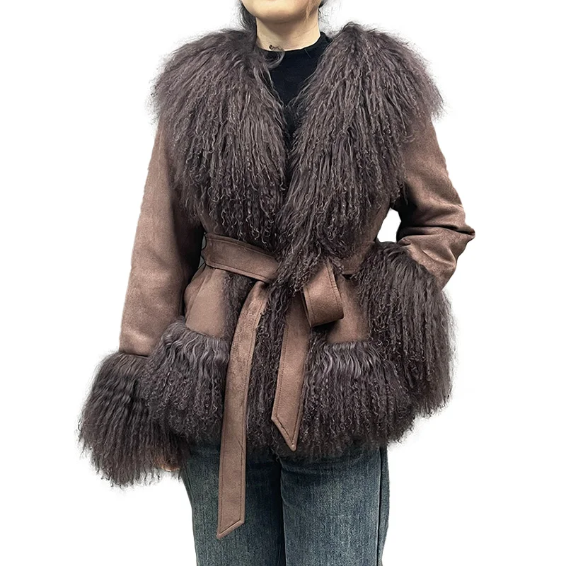 Роскошные коричневые замшевые кожаные куртки пушистые манжеты с меховым воротником женские