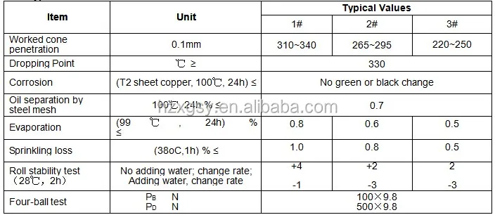 Water resistant grease for heavy duty bearings under high temperature moist conditions Applicable between -20℃ and +250℃, can be 280℃ for short time, for lubrication of (1) bearings in contact with water, for example textile and paper making machine that in touch with water for long time; (2) bearings of hot rollers, and calender bearing in steel works; (3) bearings under high temperature, for example, Tensile excavator, hot air blower, heat-setting machine, high temperature vat etc; and (4) various industrial equipment like wheel hub bearing of vehicles, heavy load machines, and steering wheels of trailers etc.