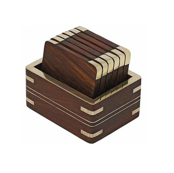Доступная Роскошная премиальная латунная инкрустация набор из 6 подстаканников для напитков дерева манго от индийского поставщика