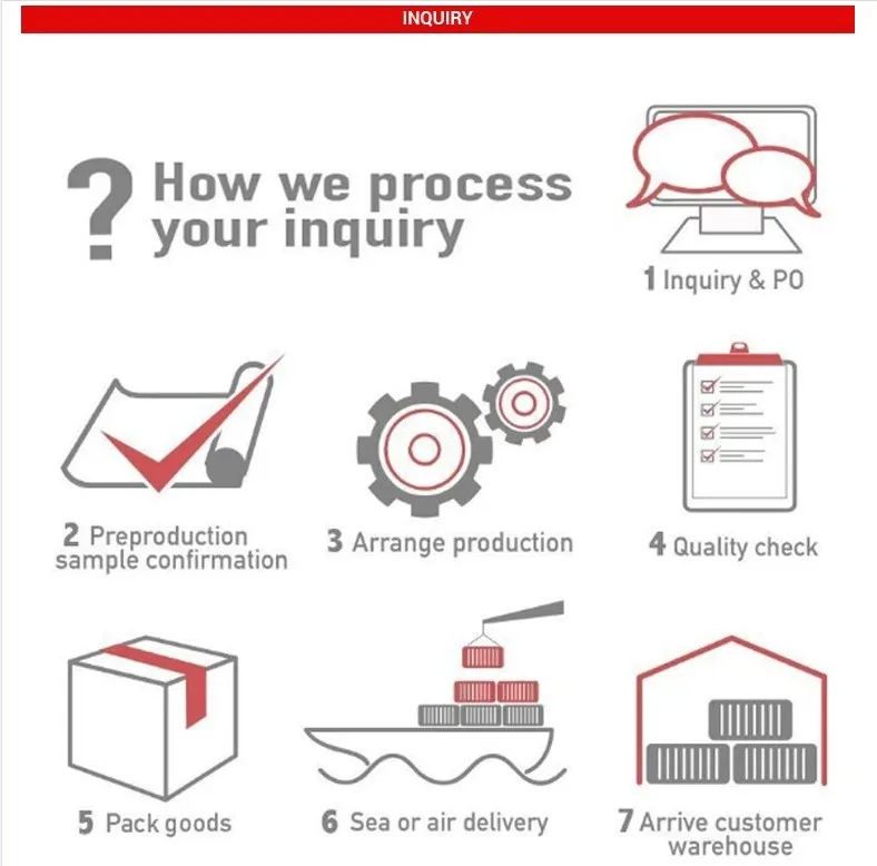 1: Can we order sample for inspection? Samples can be ordered for test and approval. Sample charges will be quoted depending upon the item, quantity, design, any special requirements etc. Samples production time is usually 7 to 14 days depending on the product, specifications, model, design etc. 2 : Which payment options are available? Payments can be made through Money Gram, Bank Transfer T/T, Western Union, PayPal (USA Only) and Letter Of Credit L/C. Other payment options can be arranged depending upon agreed terms and ordered products. 3: What is your MOQ? Our MOQ is 1 pcs of each item. Special arrangements can be made and offered for small, test or trial orders. 4: How about the packaging? Standard polybag packaging is offered for each product shipped. We also do offer customized packaging which will be extra charge based on the type of required packaging. If you have a special request for packaging, please let us know and we will help you customize it accordingly. 5: Do you offer OEM service? We do offer OEM custom design and logo to our customers. Custom logos can be placed on each product as per clients specifications as well as special requested designs based on customers instructions. 6: What is your delivery time? Delivery times are based on quantity ordered. Small orders are usually produced and shipped within 10 to 15 days. Large size order delivery times are confirmed once the order is placed depending upon the quantities needed. |